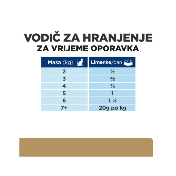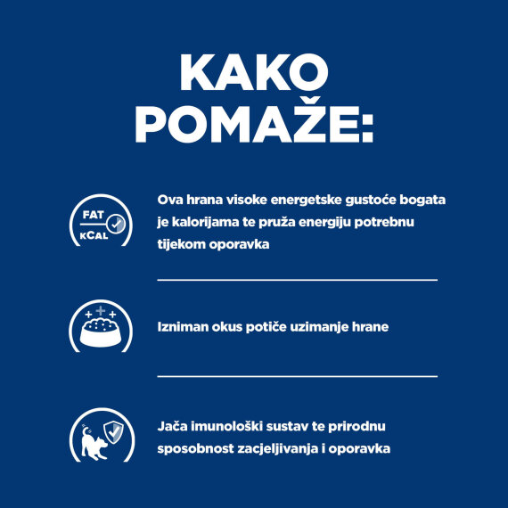 Kompletna dijetetska hrana za uvođenje u normalnu ishranu (oporavak) i za masnu jetru kod mačaka. Ovo je visokokalorična hrana koja ima visoku koncentraciju esencijalnih hranljivih materija i lako svarljivih sastojaka.